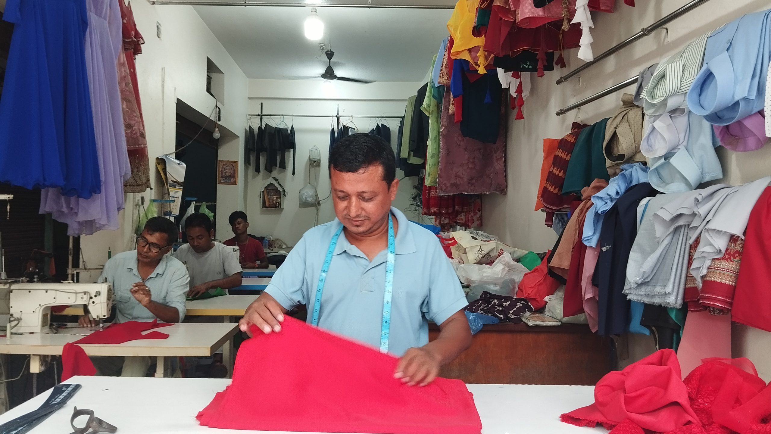 पथरीशनिश्चरे । मोरङको पथरीशनिश्चरे –२ वुद्धचौकका ४४ वर्षीय सुवास सुन्दासले कपडामा स्केल राखेर कैंची चलाउन..